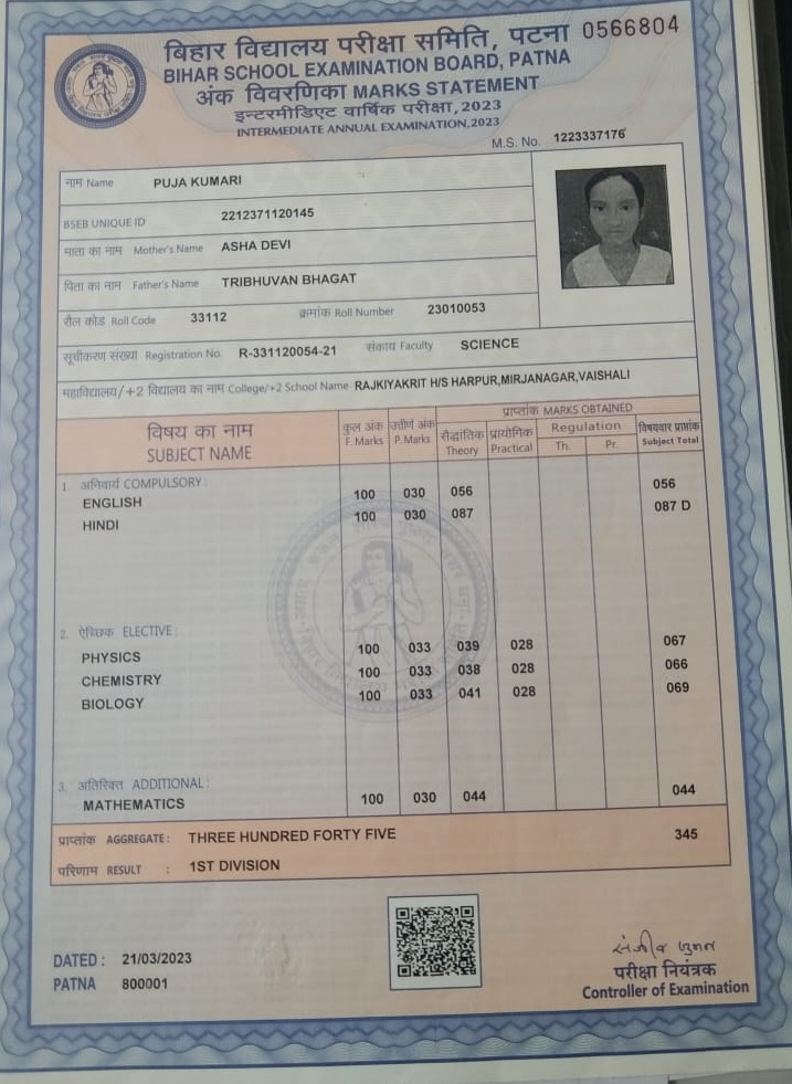 | Exam | Full Marks | Pass Marks | Marks Obtained |