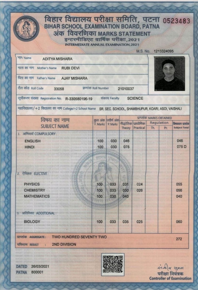 | Exam | Full Marks | Pass Marks | Marks Obtained |
