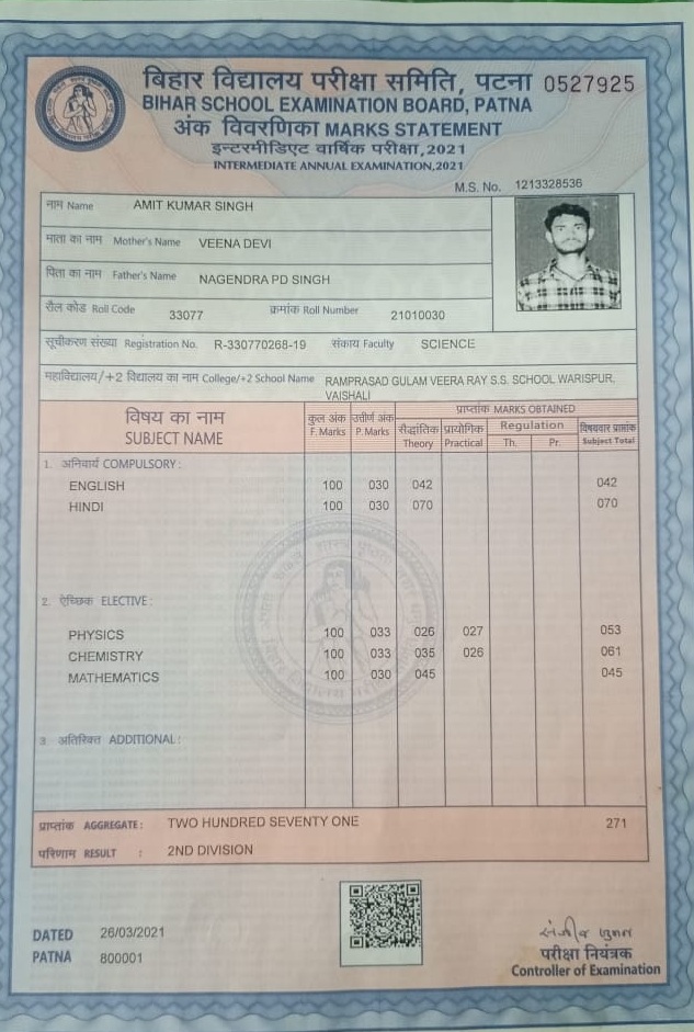 | Exam | Full Marks | Pass Marks | Marks Obtained |