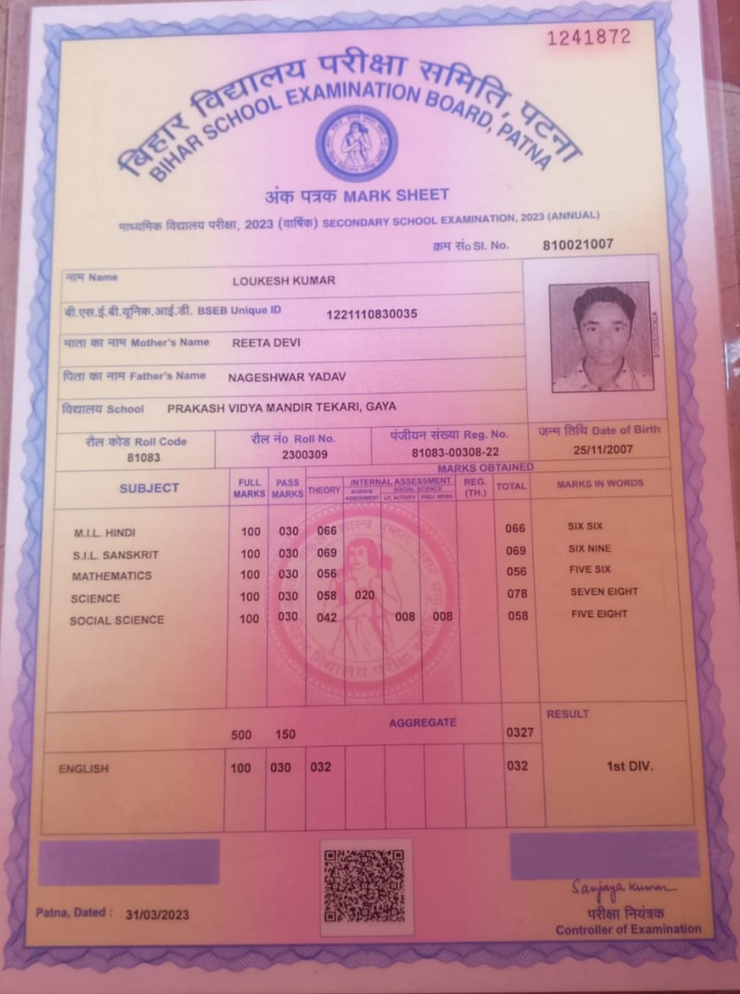 | Exam | Full Marks | Pass Marks | Marks Obtained |
