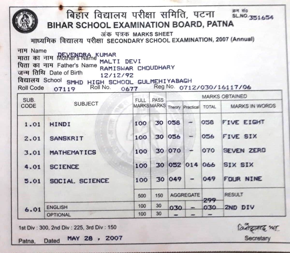 | Exam | Full Marks | Pass Marks | Marks Obtained |