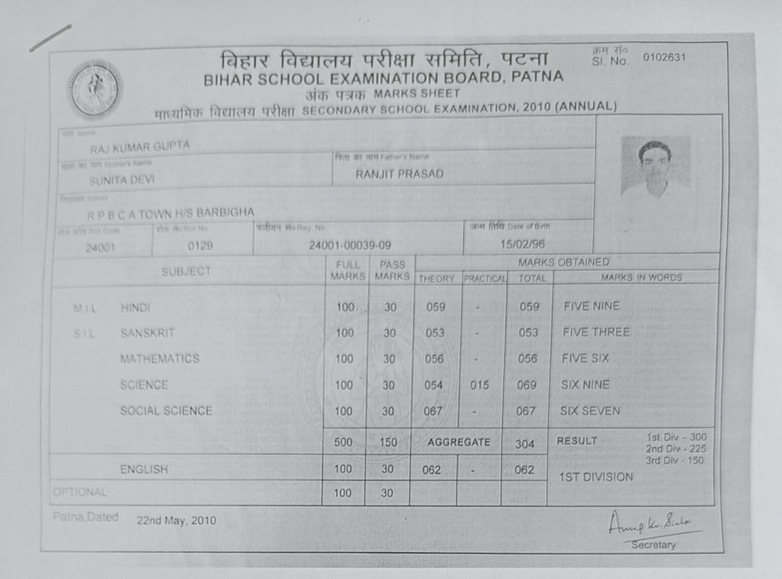 | Exam | Full Marks | Pass Marks | Marks Obtained |