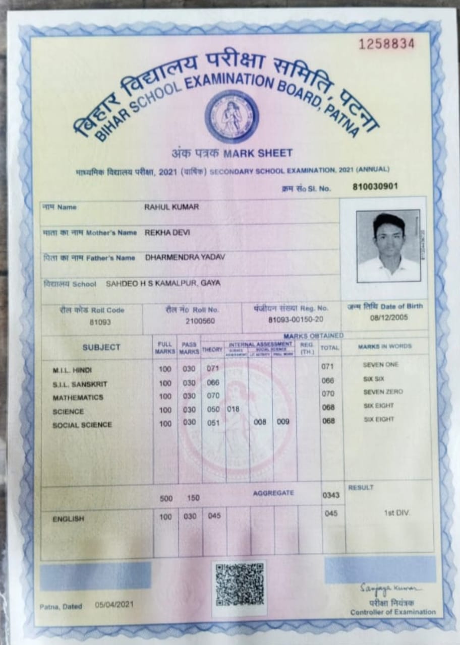 | Exam | Full Marks | Pass Marks | Marks Obtained |