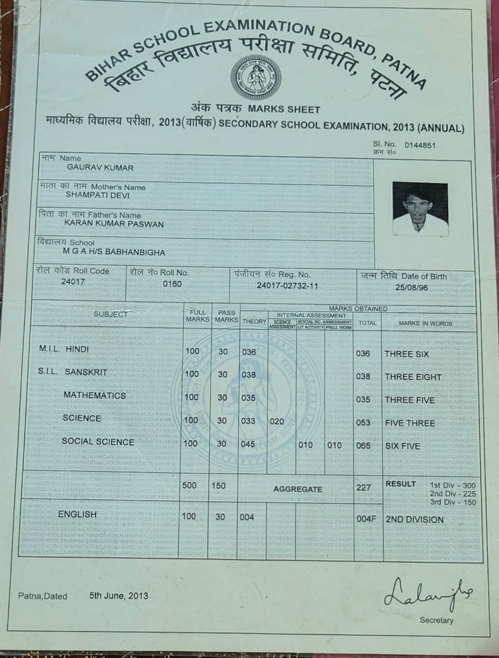 | Exam | Full Marks | Pass Marks | Marks Obtained |