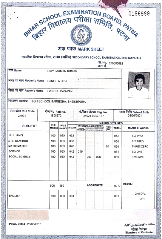 | Exam | Full Marks | Pass Marks | Marks Obtained |