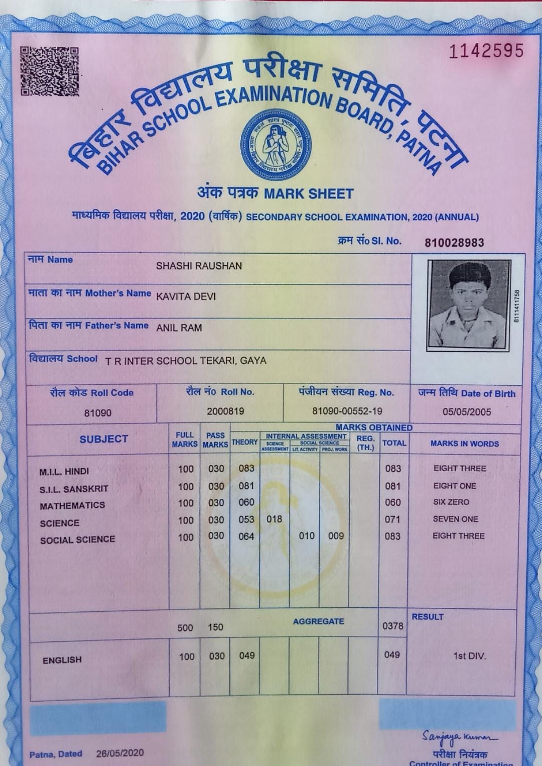 | Exam | Full Marks | Pass Marks | Marks Obtained |