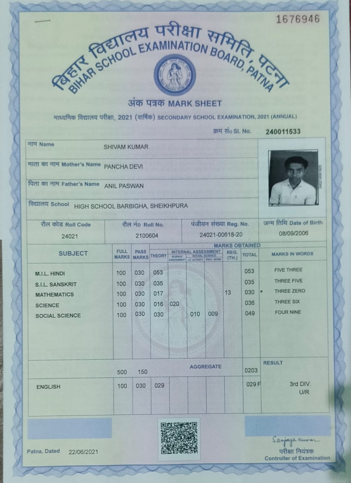 | Exam | Full Marks | Pass Marks | Marks Obtained |