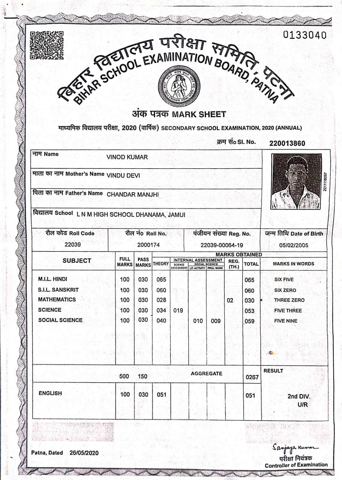 | Exam | Full Marks | Pass Marks | Marks Obtained |