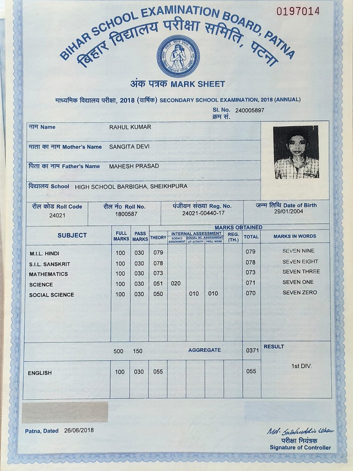 | Exam | Full Marks | Pass Marks | Marks Obtained |