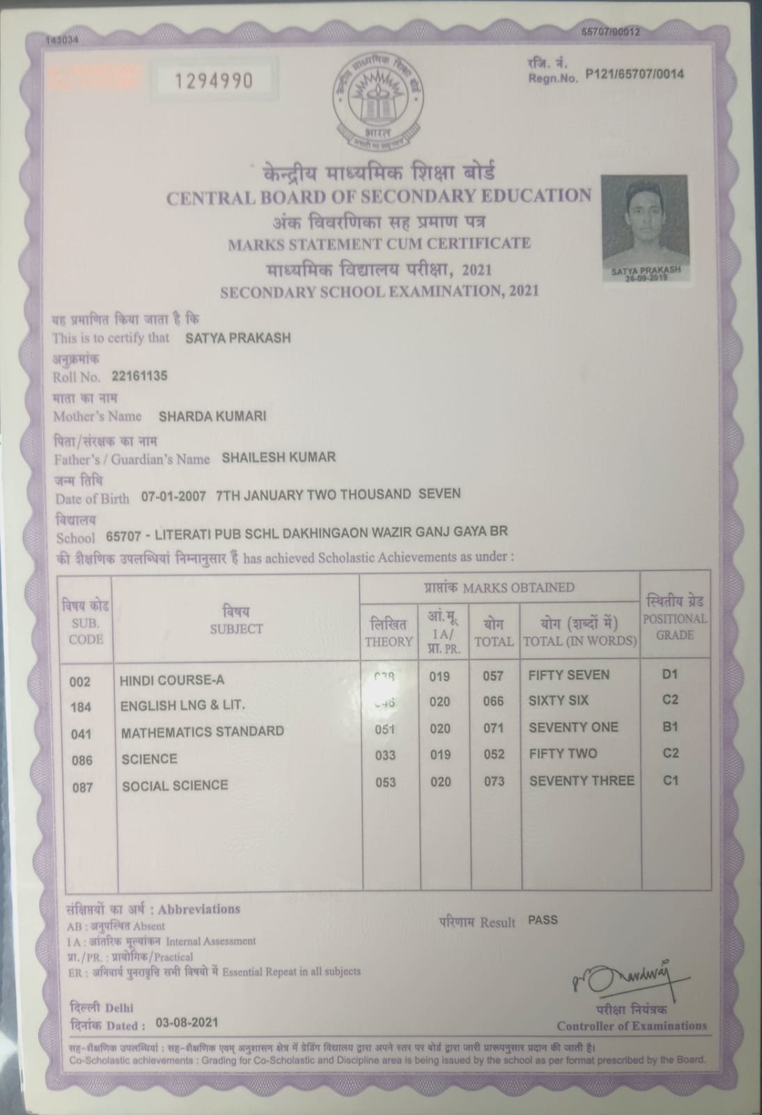 | Exam | Full Marks | Pass Marks | Marks Obtained |