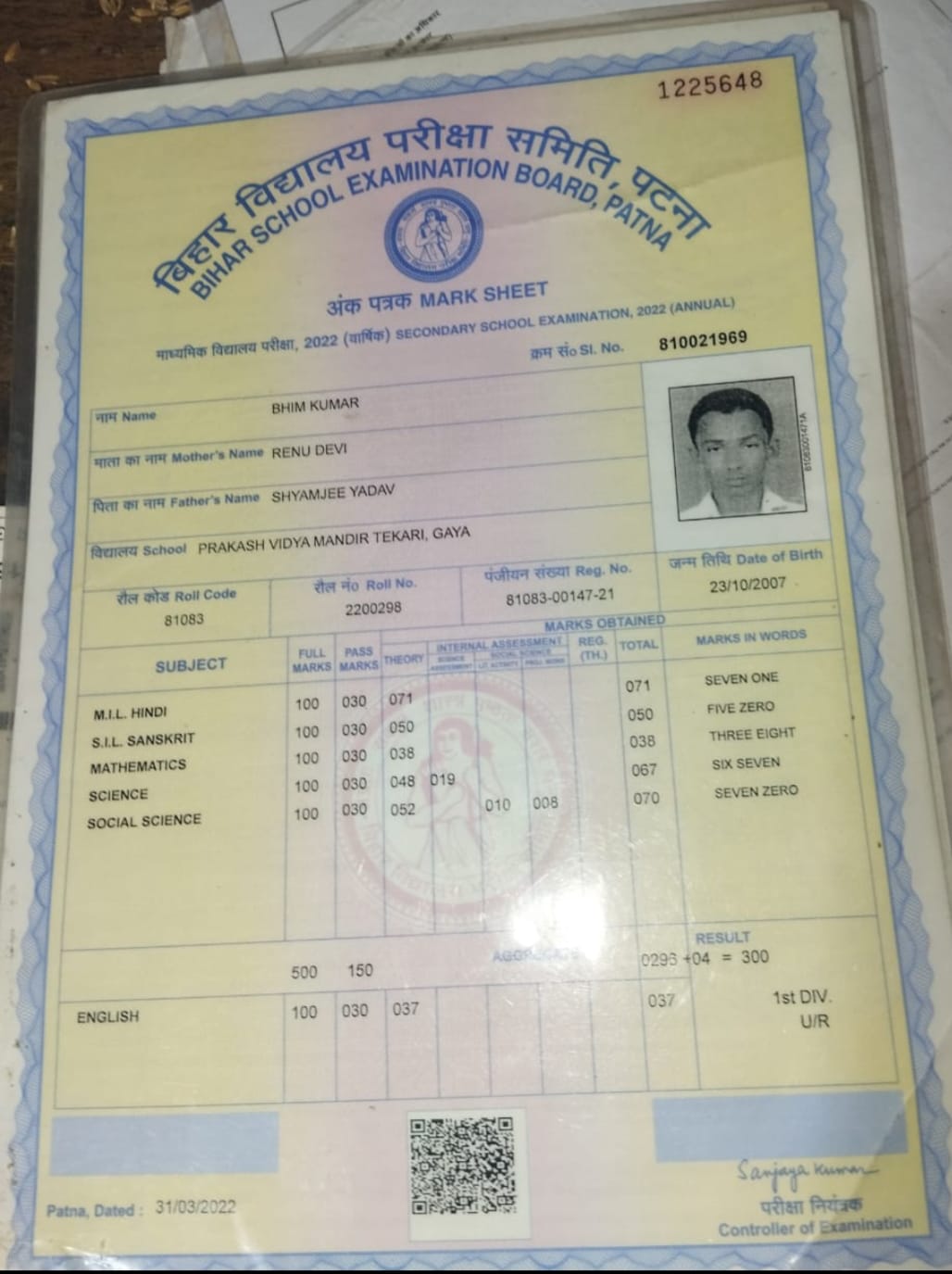 | Exam | Full Marks | Pass Marks | Marks Obtained |