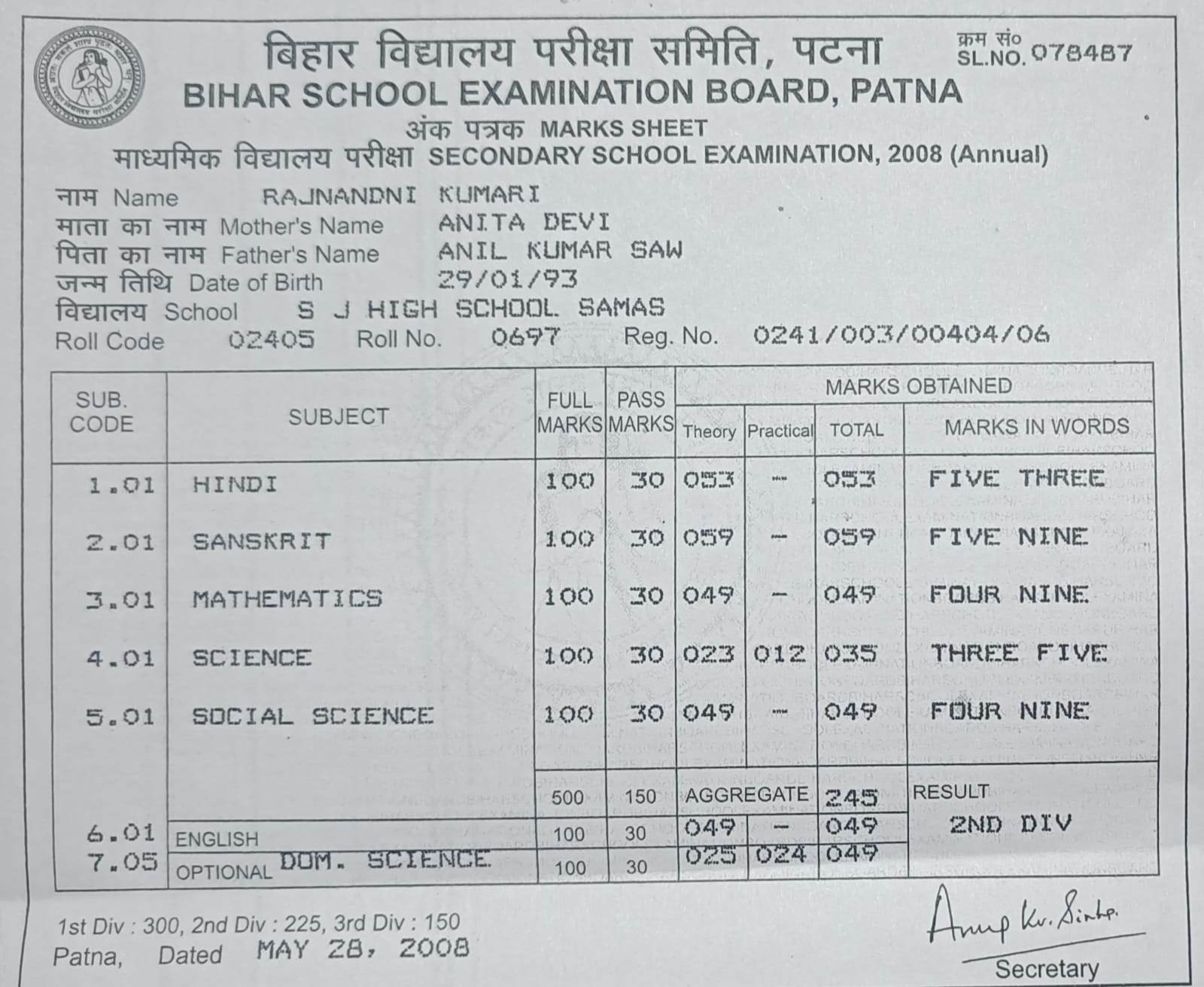 | Exam | Full Marks | Pass Marks | Marks Obtained |