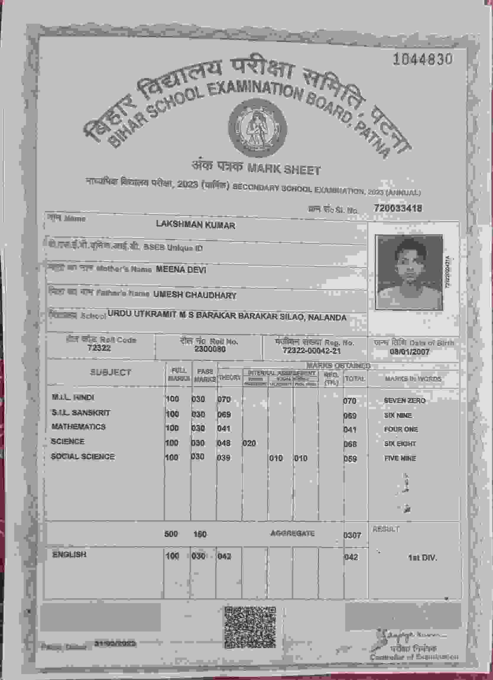 | Exam | Full Marks | Pass Marks | Marks Obtained |