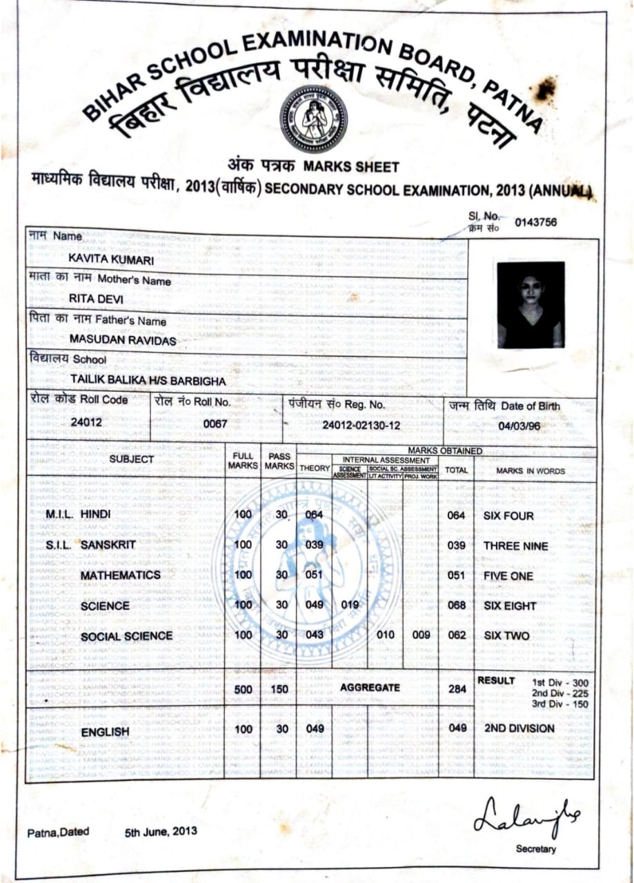 | Exam | Full Marks | Pass Marks | Marks Obtained |