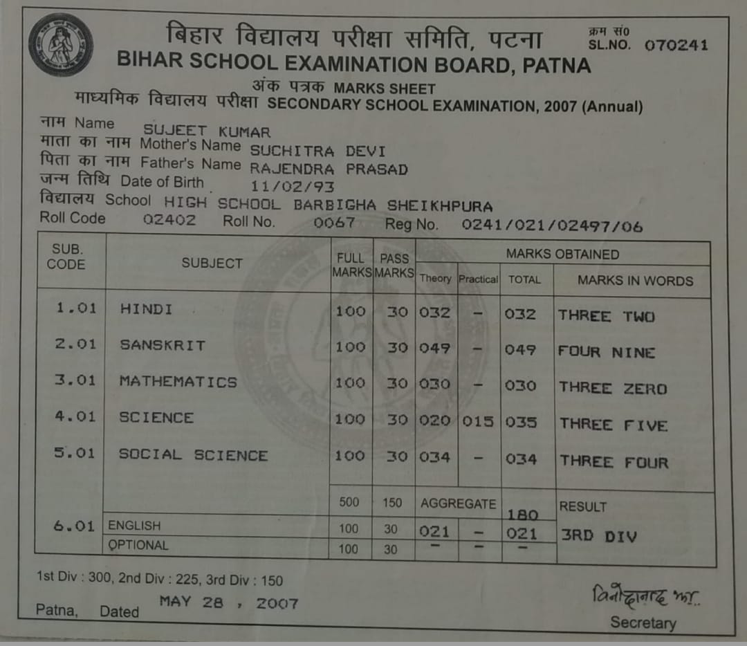 | Exam | Full Marks | Pass Marks | Marks Obtained |