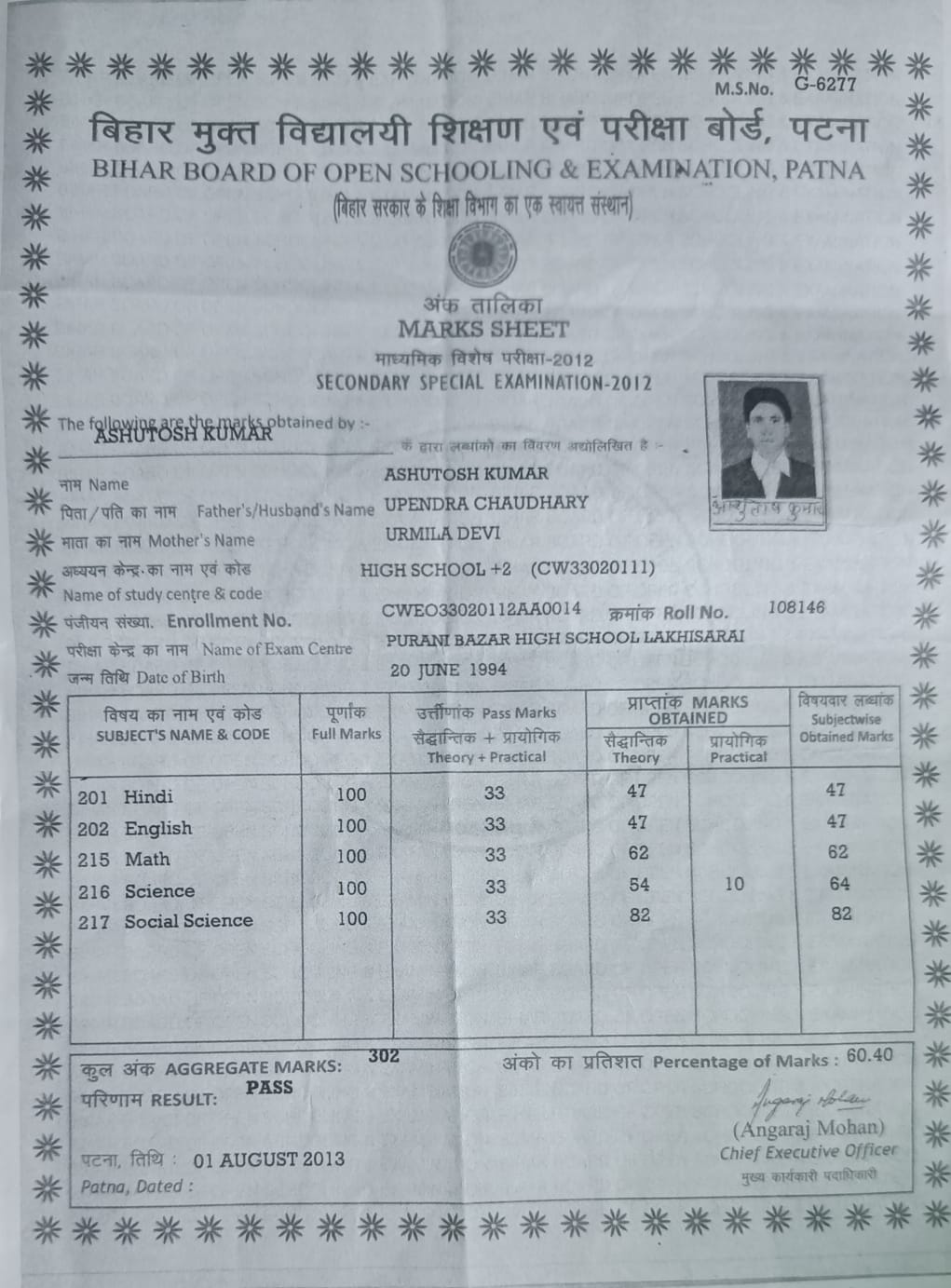 | Exam | Full Marks | Pass Marks | Marks Obtained |