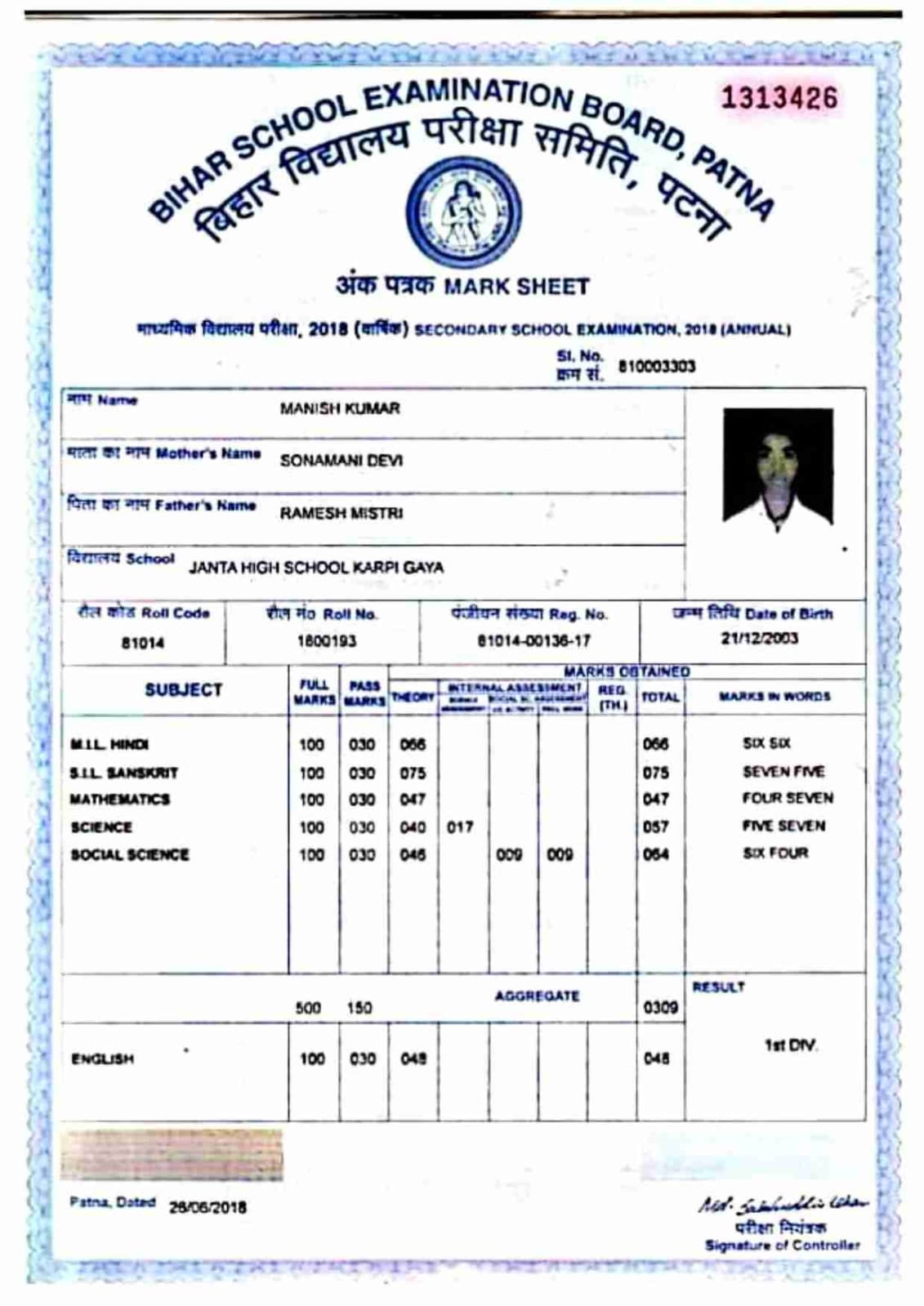 | Exam | Full Marks | Pass Marks | Marks Obtained |