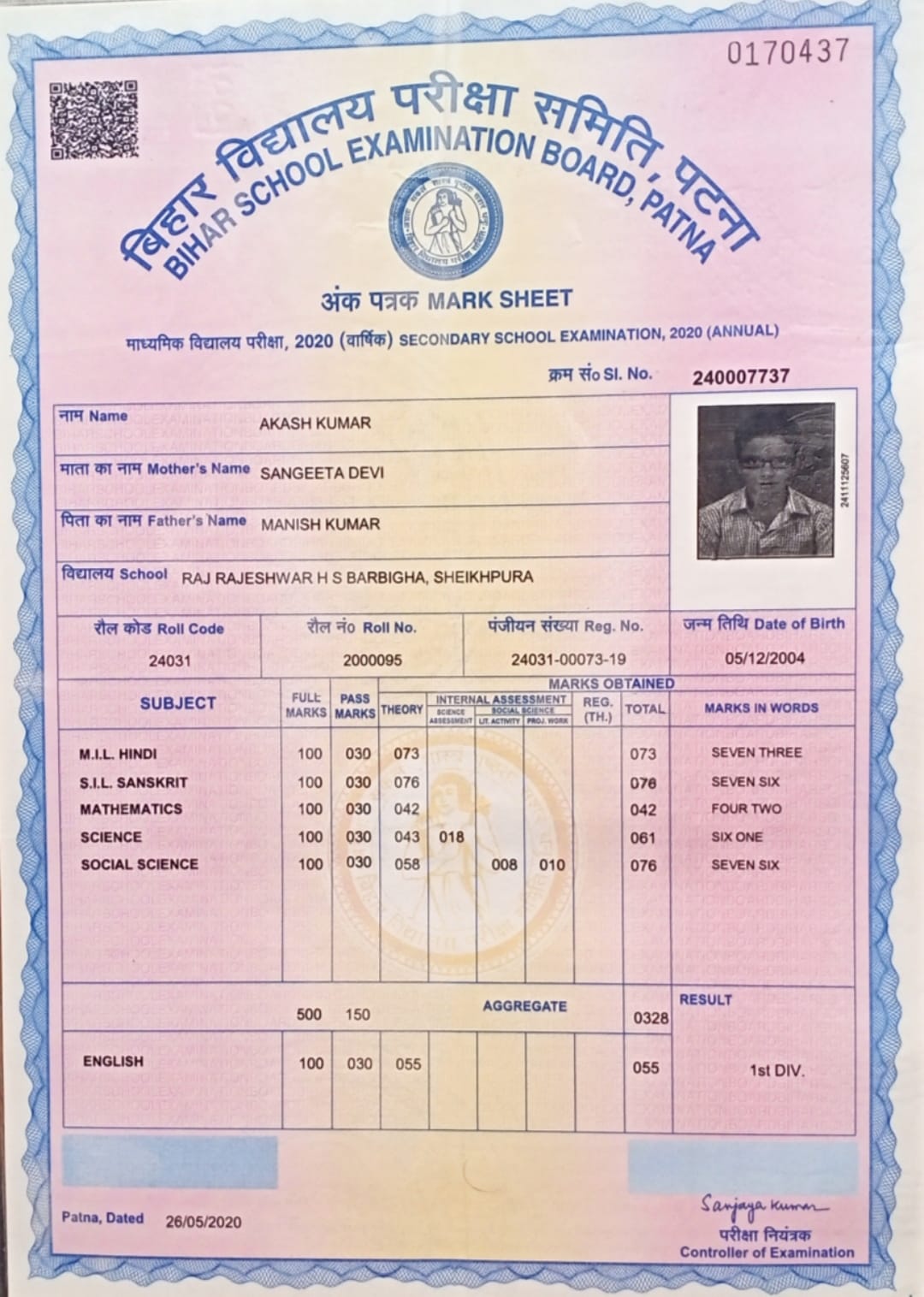 | Exam | Full Marks | Pass Marks | Marks Obtained |