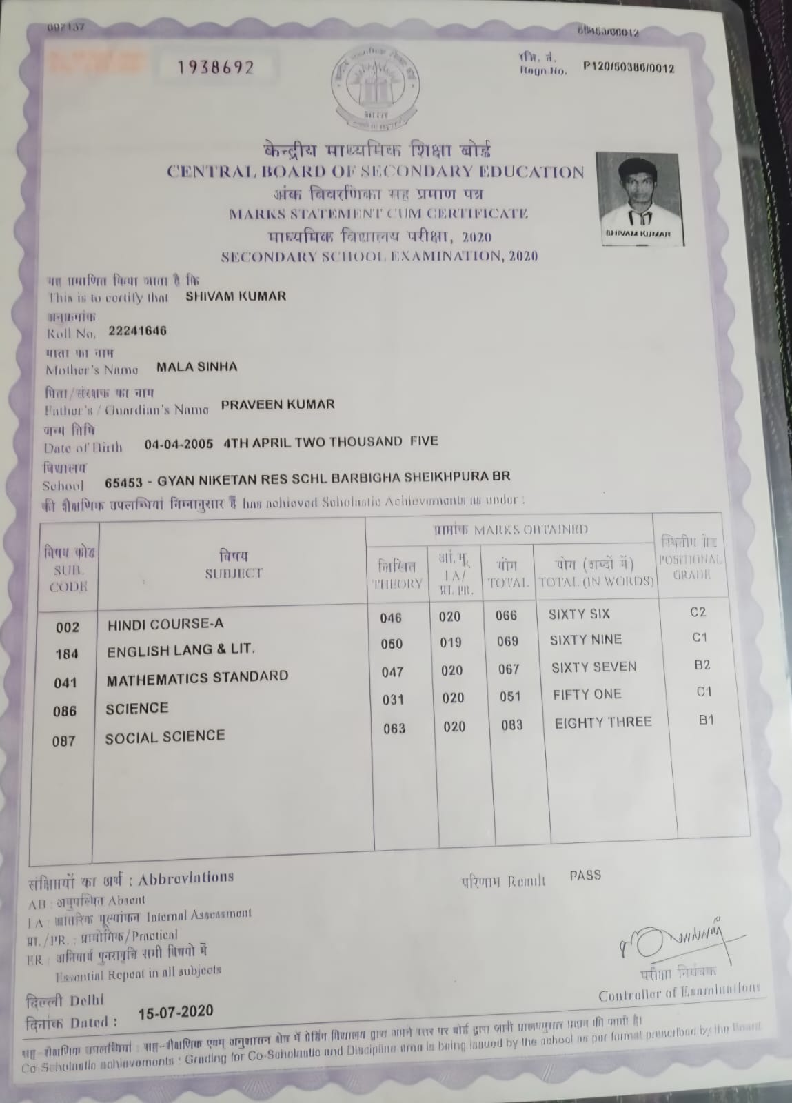 | Exam | Full Marks | Pass Marks | Marks Obtained |