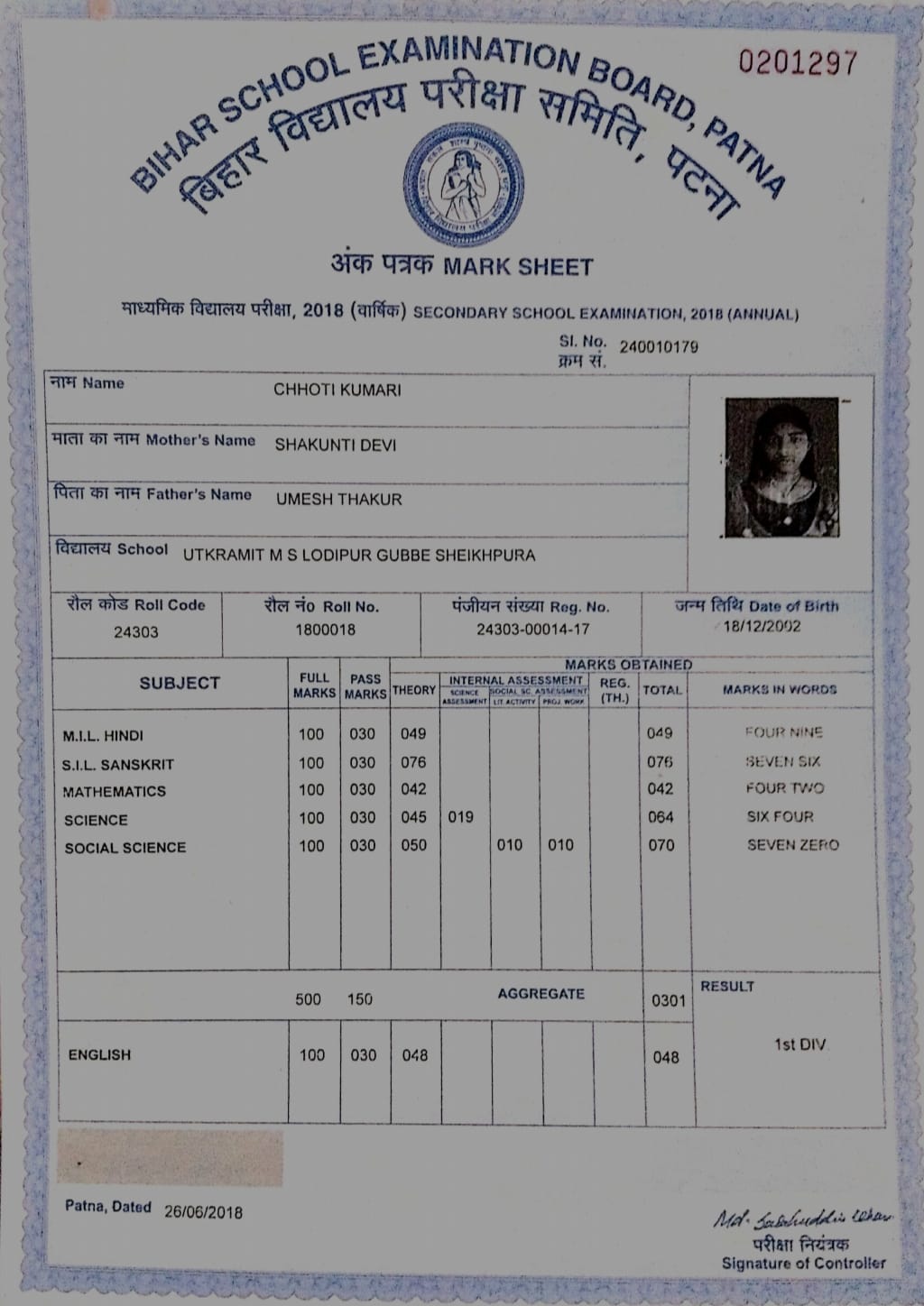 | Exam | Full Marks | Pass Marks | Marks Obtained |