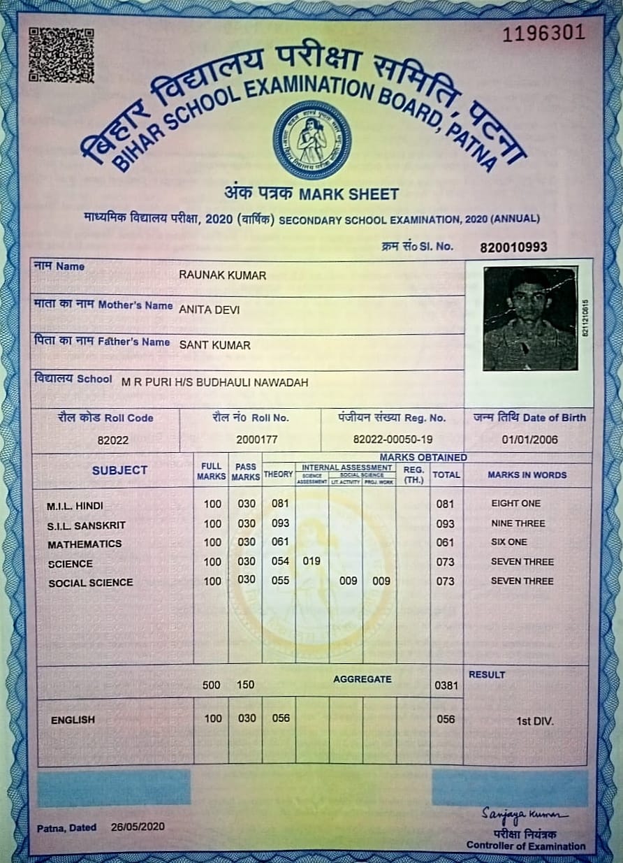 | Exam | Full Marks | Pass Marks | Marks Obtained |