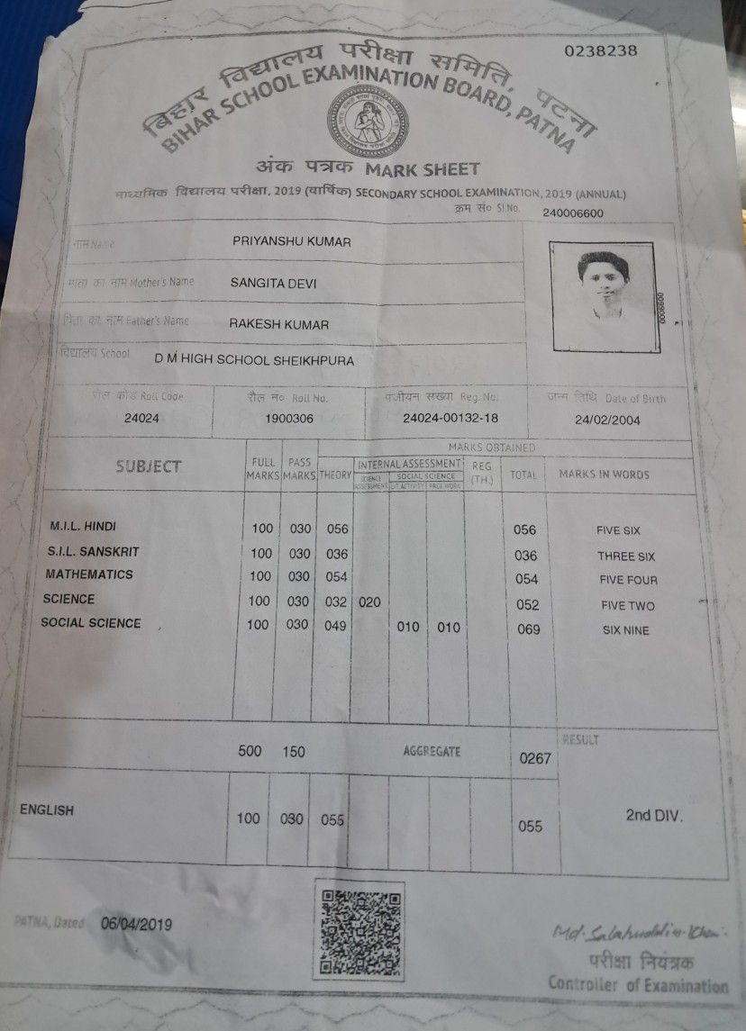 | Exam | Full Marks | Pass Marks | Marks Obtained |