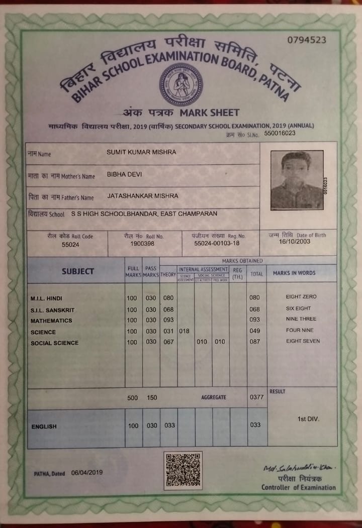 | Exam | Full Marks | Pass Marks | Marks Obtained |