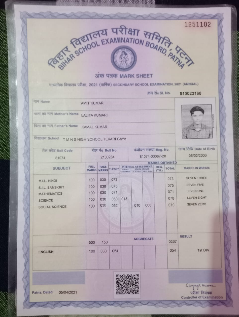 | Exam | Full Marks | Pass Marks | Marks Obtained |