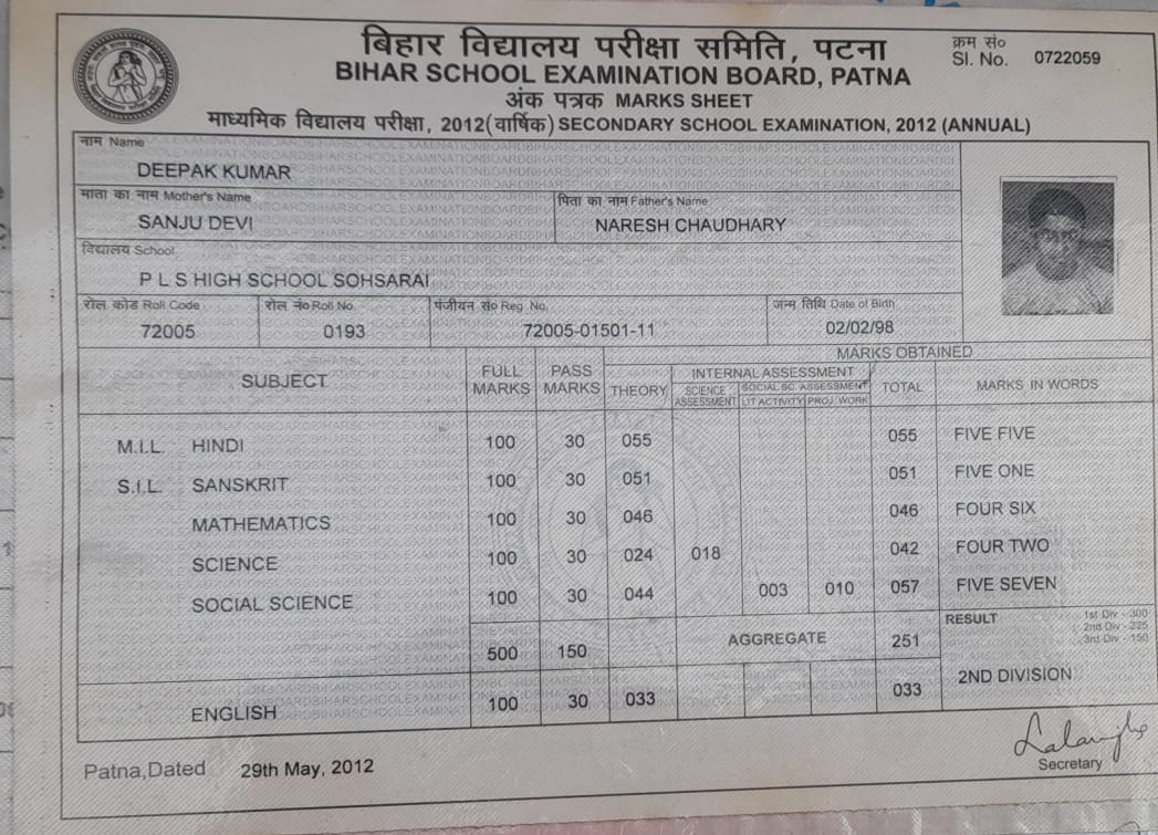 | Exam | Full Marks | Pass Marks | Marks Obtained |