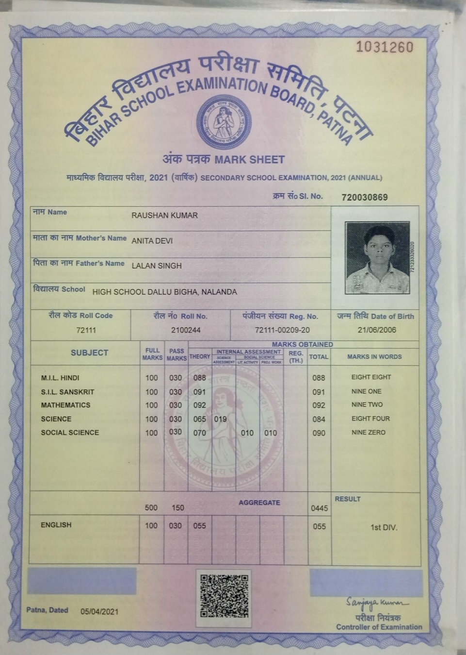 | Exam | Full Marks | Pass Marks | Marks Obtained |