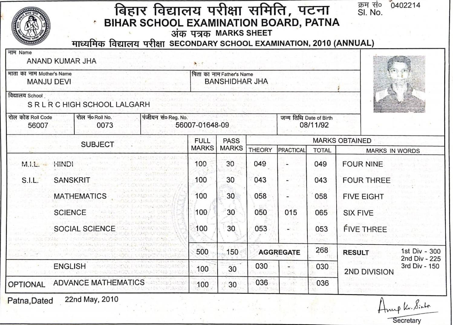 | Exam | Full Marks | Pass Marks | Marks Obtained |
