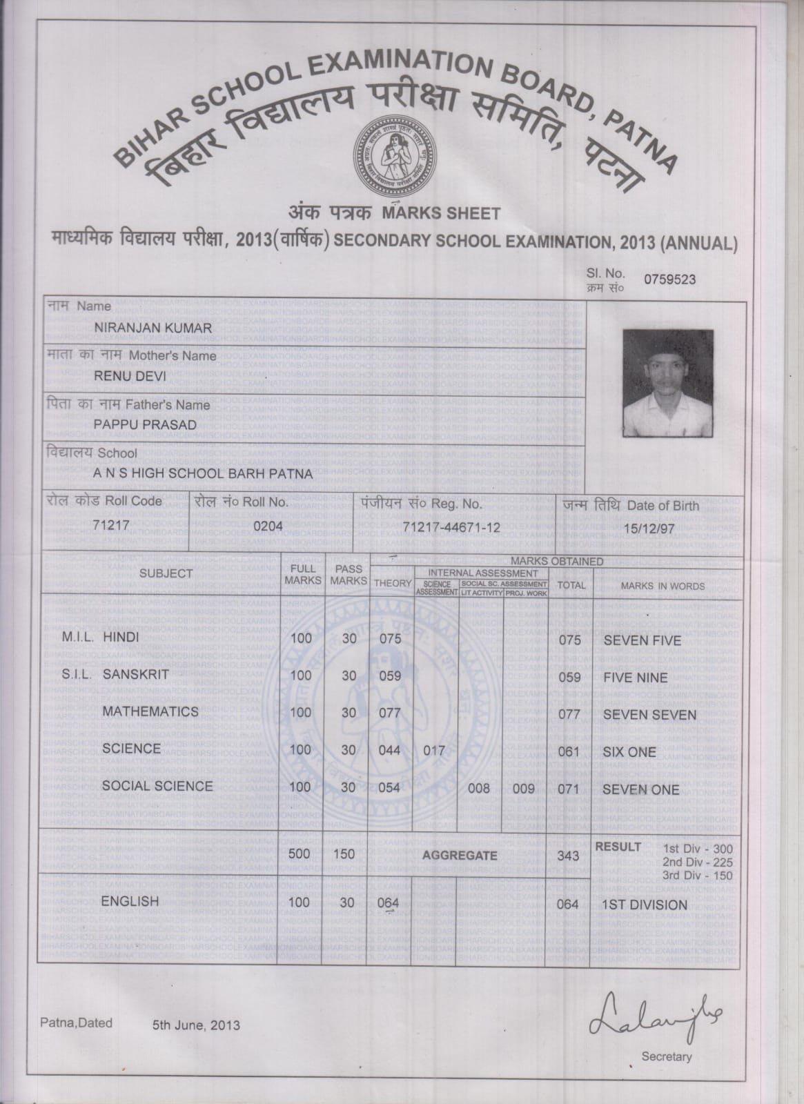 | Exam | Full Marks | Pass Marks | Marks Obtained |
