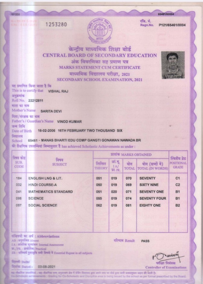 | Exam | Full Marks | Pass Marks | Marks Obtained |