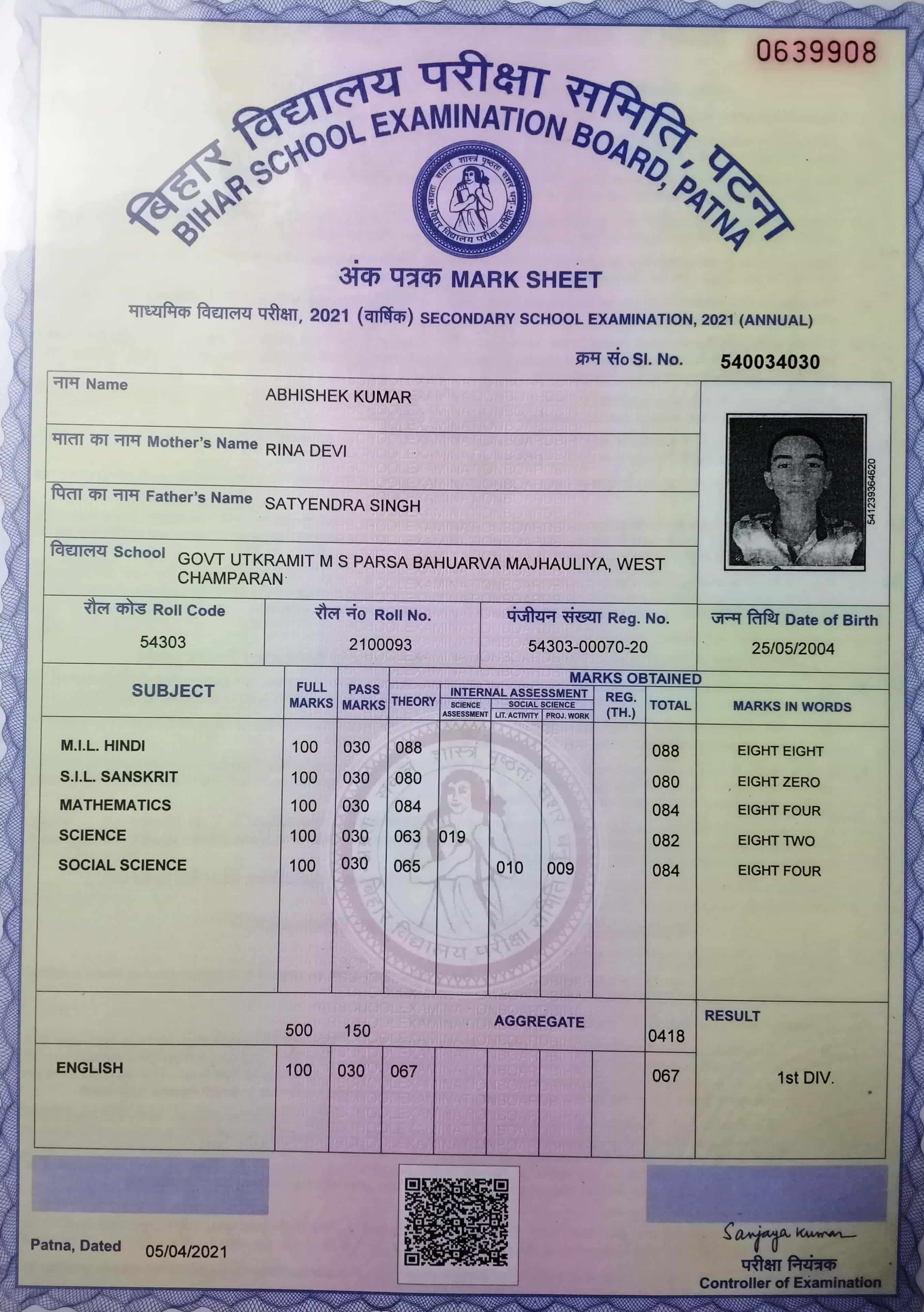 | Exam | Full Marks | Pass Marks | Marks Obtained |