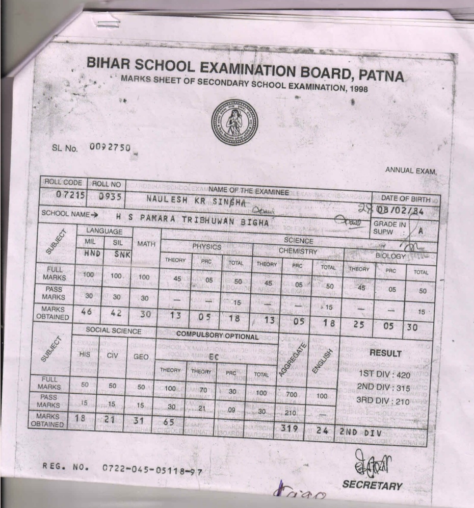 | Exam | Full Marks | Pass Marks | Marks Obtained |