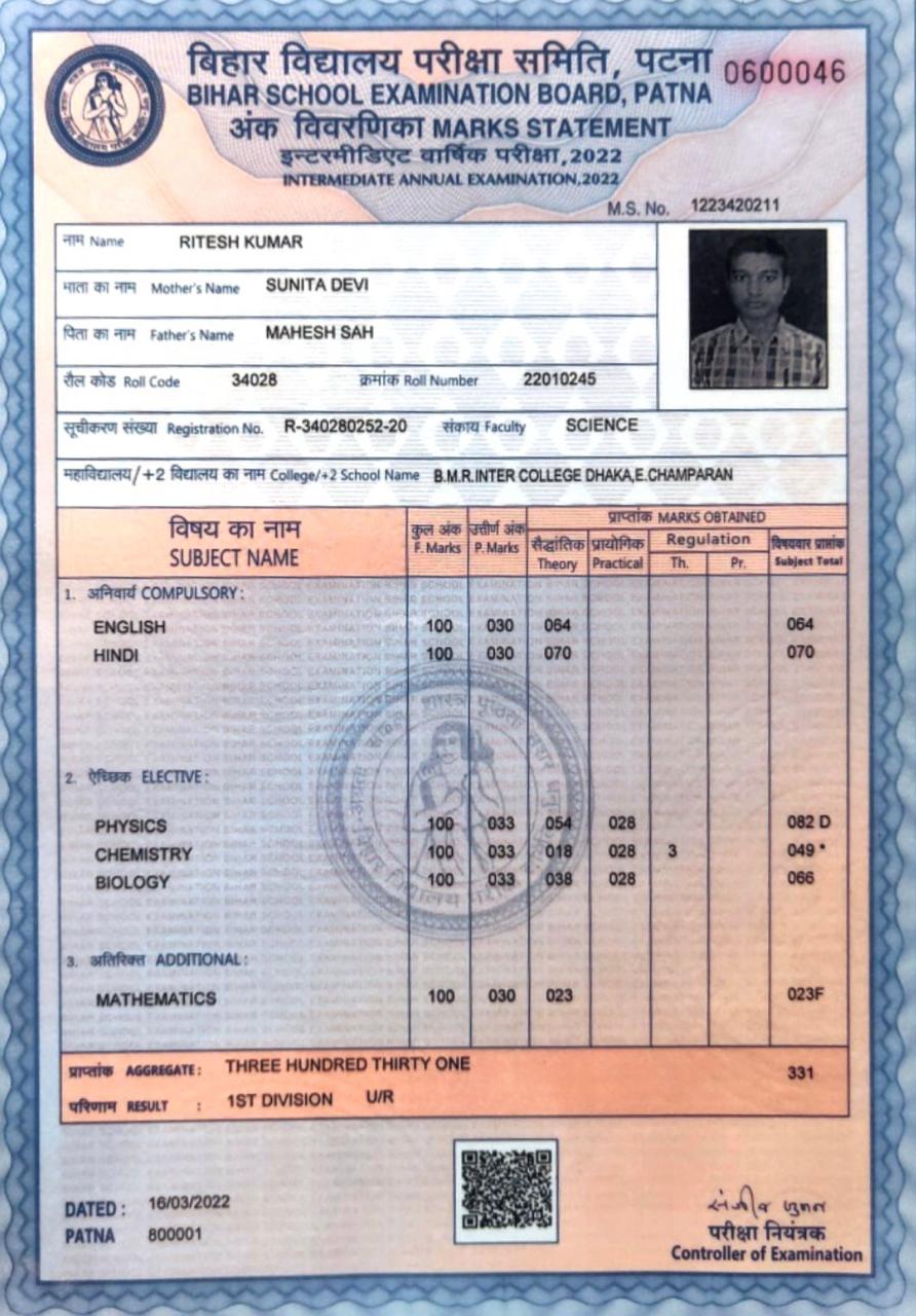 | Exam | Full Marks | Pass Marks | Marks Obtained |