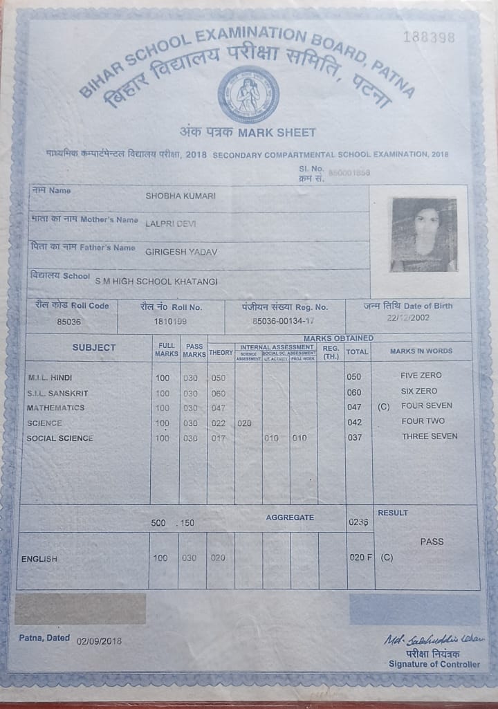 | Exam | Full Marks | Pass Marks | Marks Obtained |