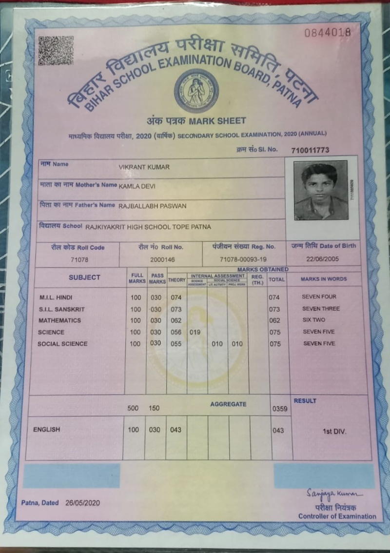 | Exam | Full Marks | Pass Marks | Marks Obtained |