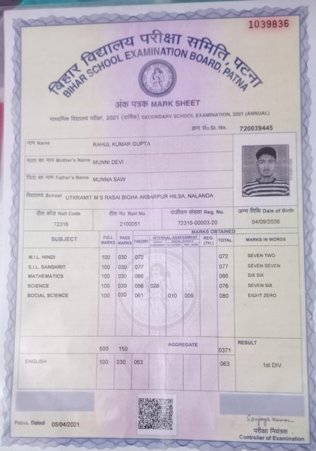 | Exam | Full Marks | Pass Marks | Marks Obtained |