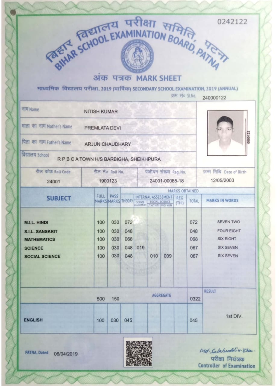 | Exam | Full Marks | Pass Marks | Marks Obtained |