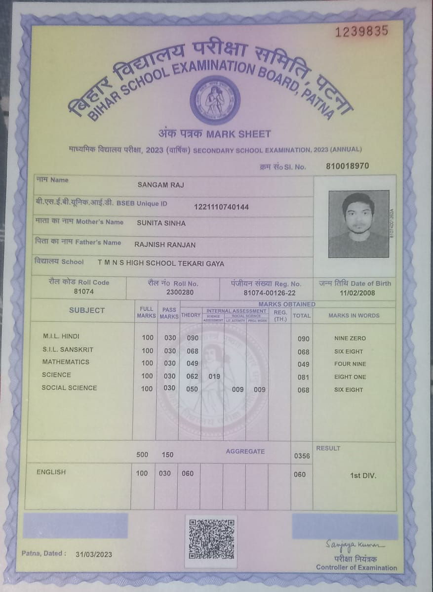 | Exam | Full Marks | Pass Marks | Marks Obtained |