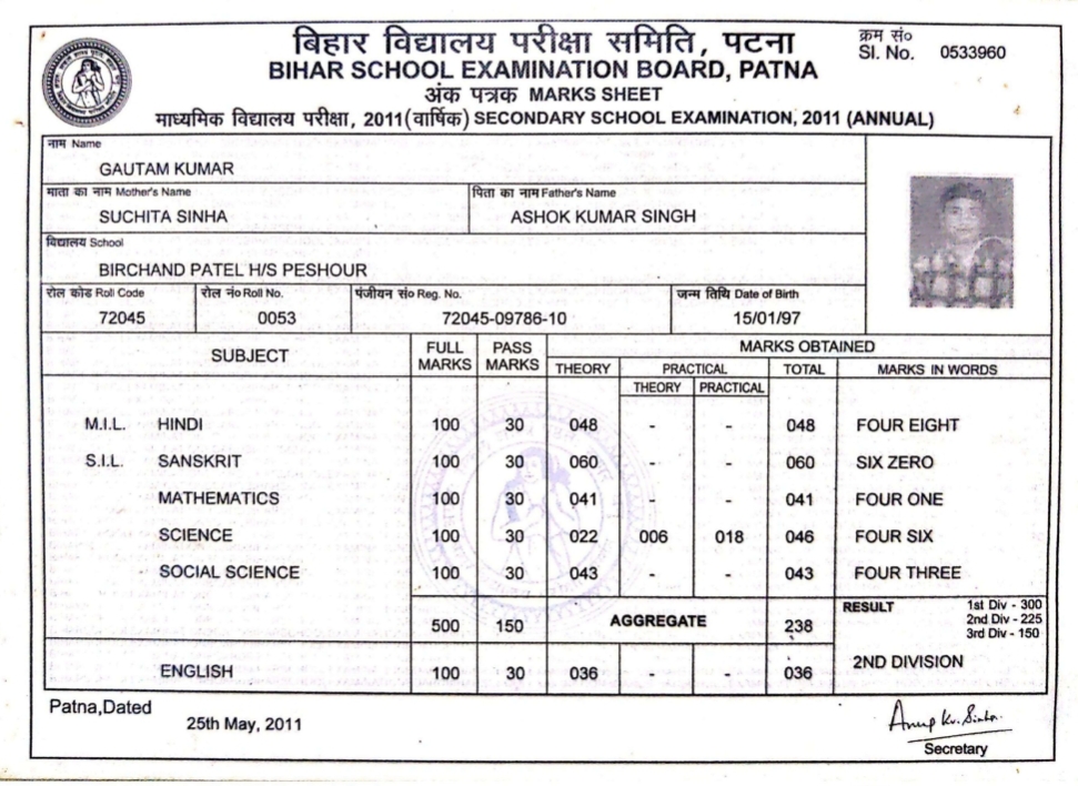 | Exam | Full Marks | Pass Marks | Marks Obtained |