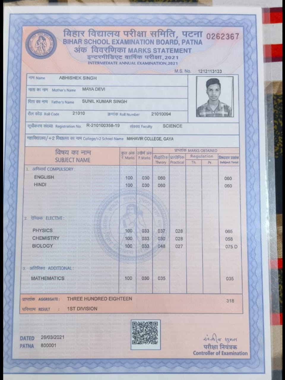 | Exam | Full Marks | Pass Marks | Marks Obtained |