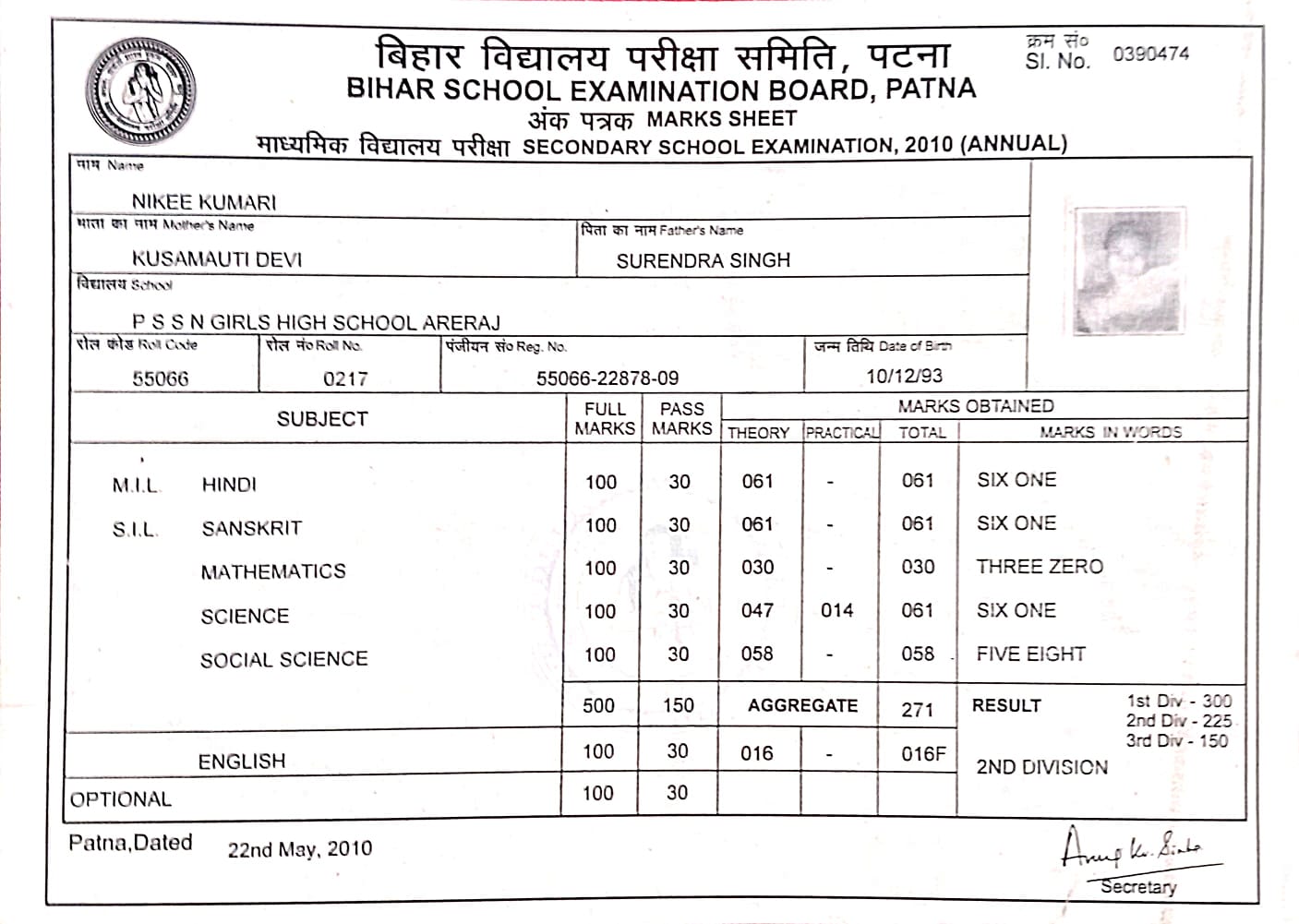 | Exam | Full Marks | Pass Marks | Marks Obtained |