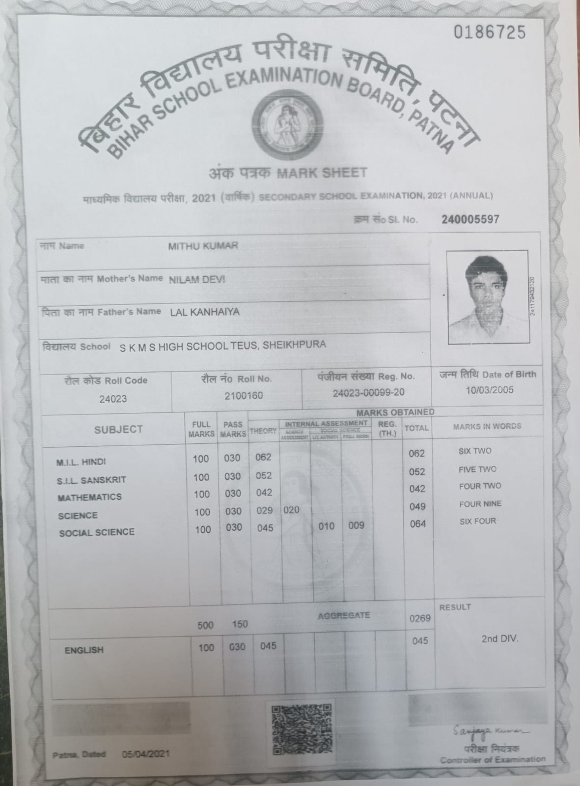 | Exam | Full Marks | Pass Marks | Marks Obtained |