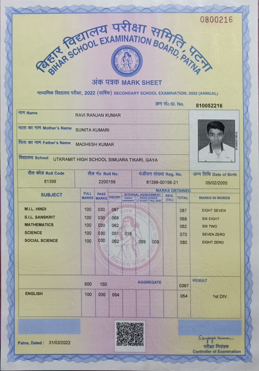 | Exam | Full Marks | Pass Marks | Marks Obtained |