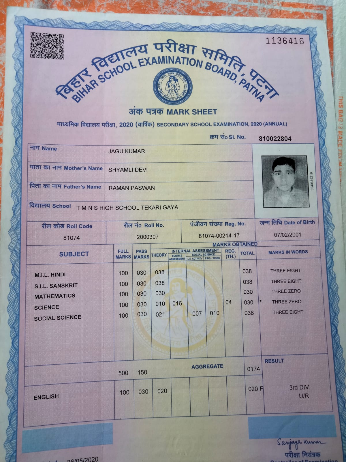 | Exam | Full Marks | Pass Marks | Marks Obtained |