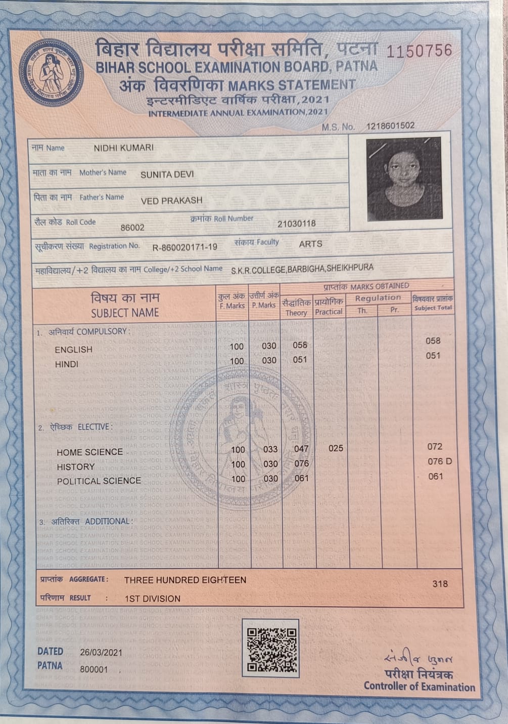 | Exam | Full Marks | Pass Marks | Marks Obtained |