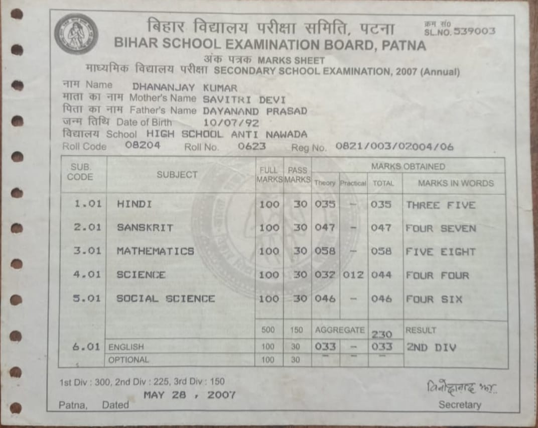 | Exam | Full Marks | Pass Marks | Marks Obtained |