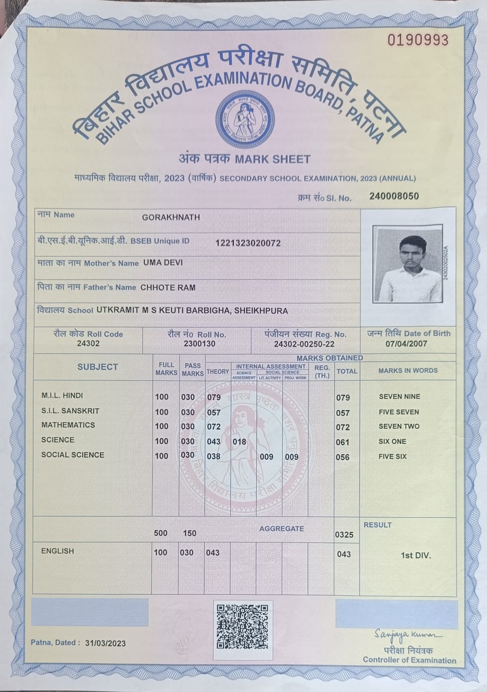 | Exam | Full Marks | Pass Marks | Marks Obtained |